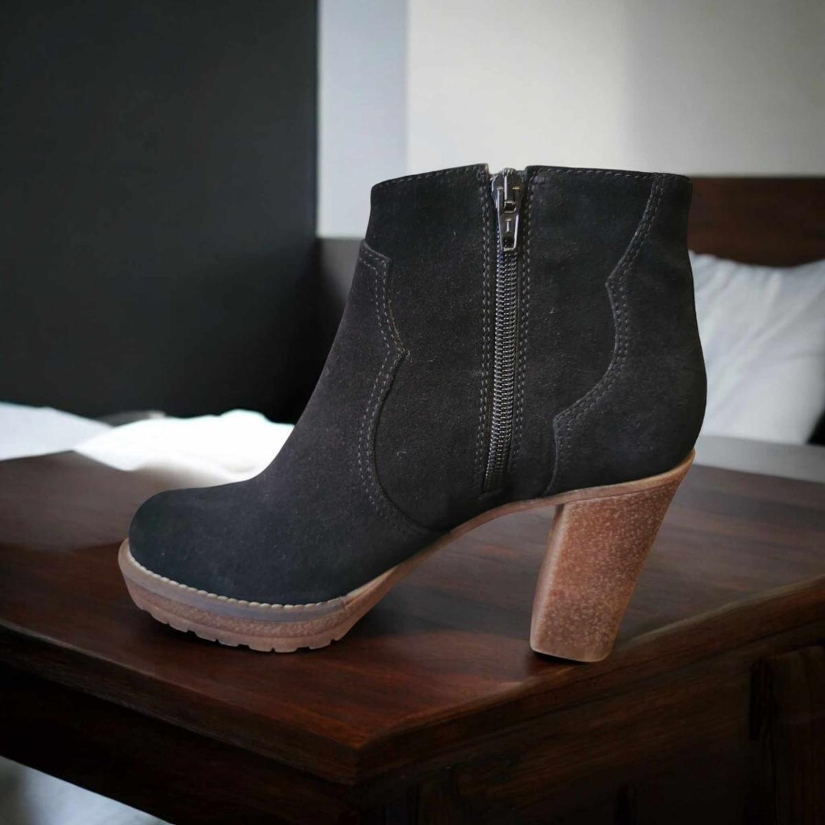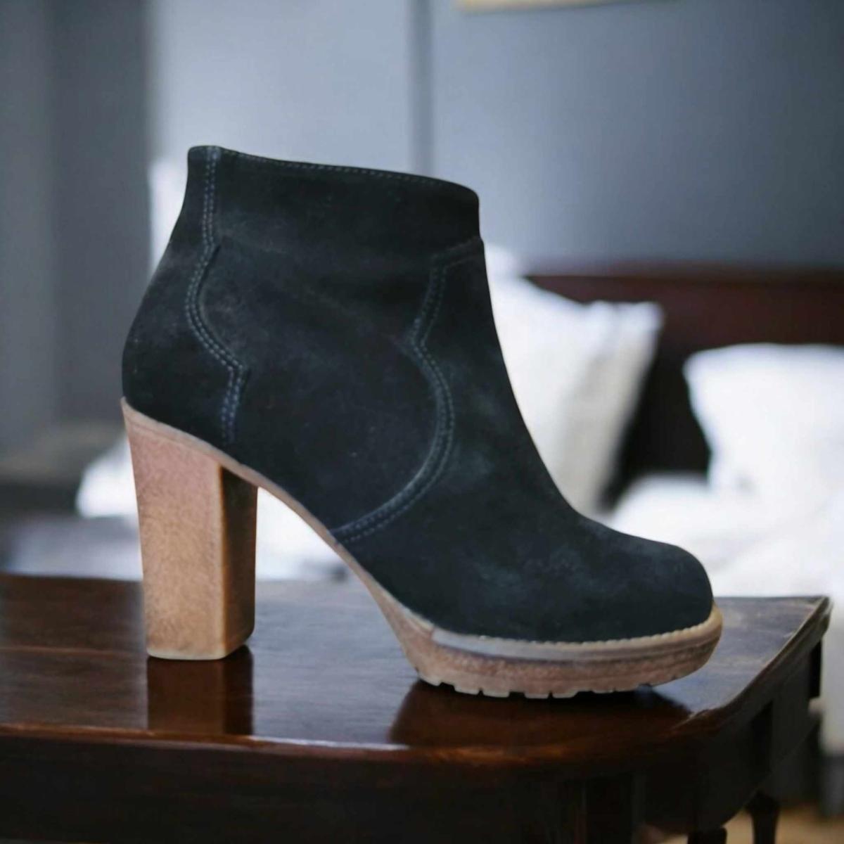 Boots en croûte de cuir italien, talon large et plateau à l'avant pour un confort optimal.