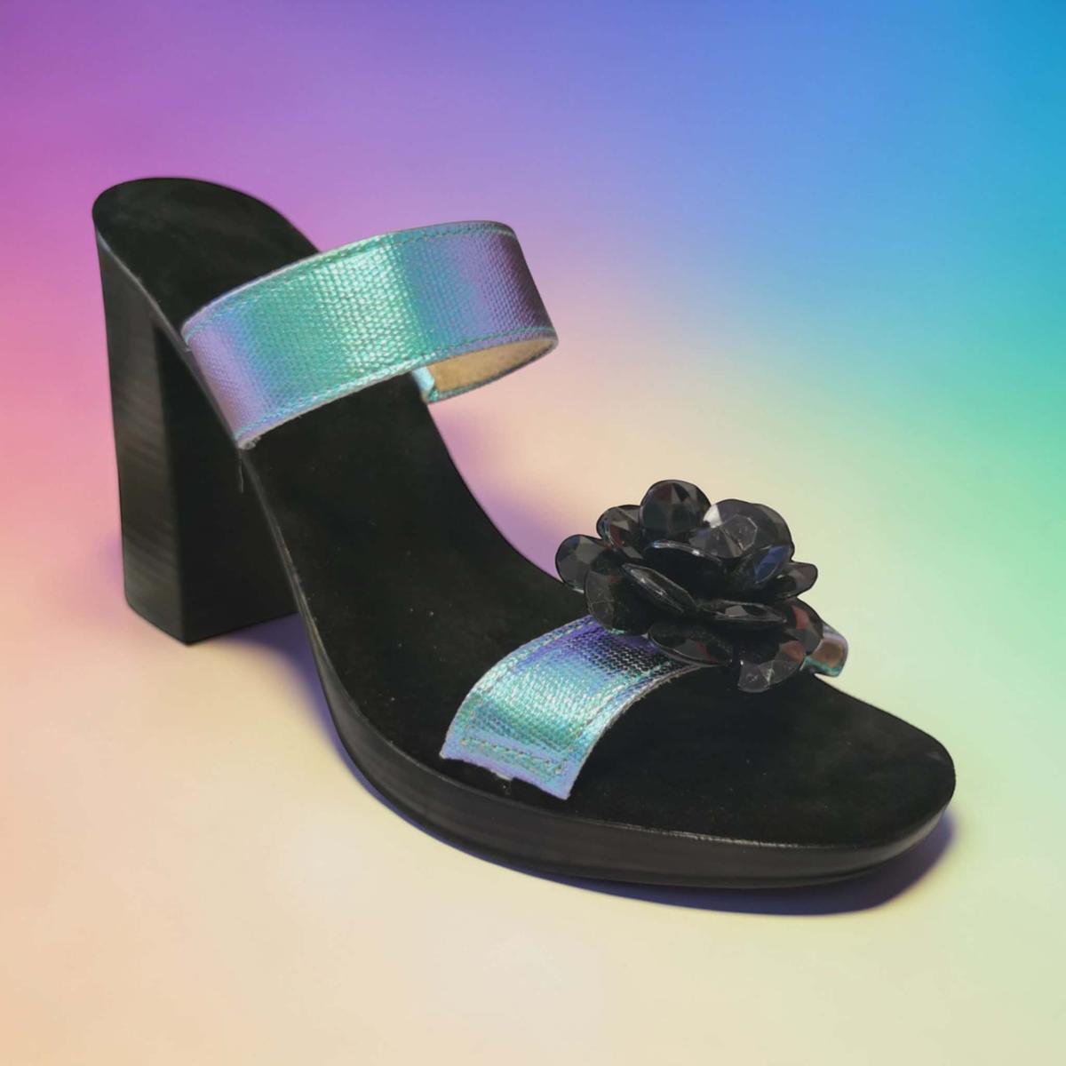Les brides arrière en tissu irisé prenant des teintes variées selon la lumière.