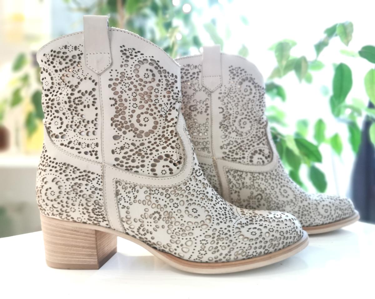 Wunderschöne beigefarbene Lederstiefel mit Laserperforation.