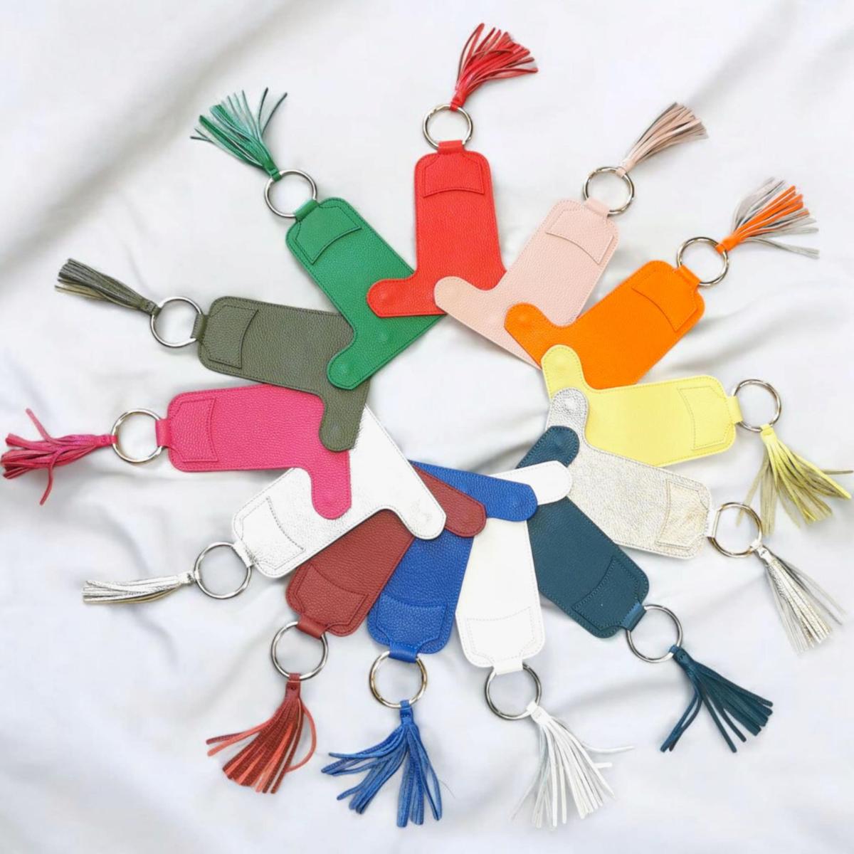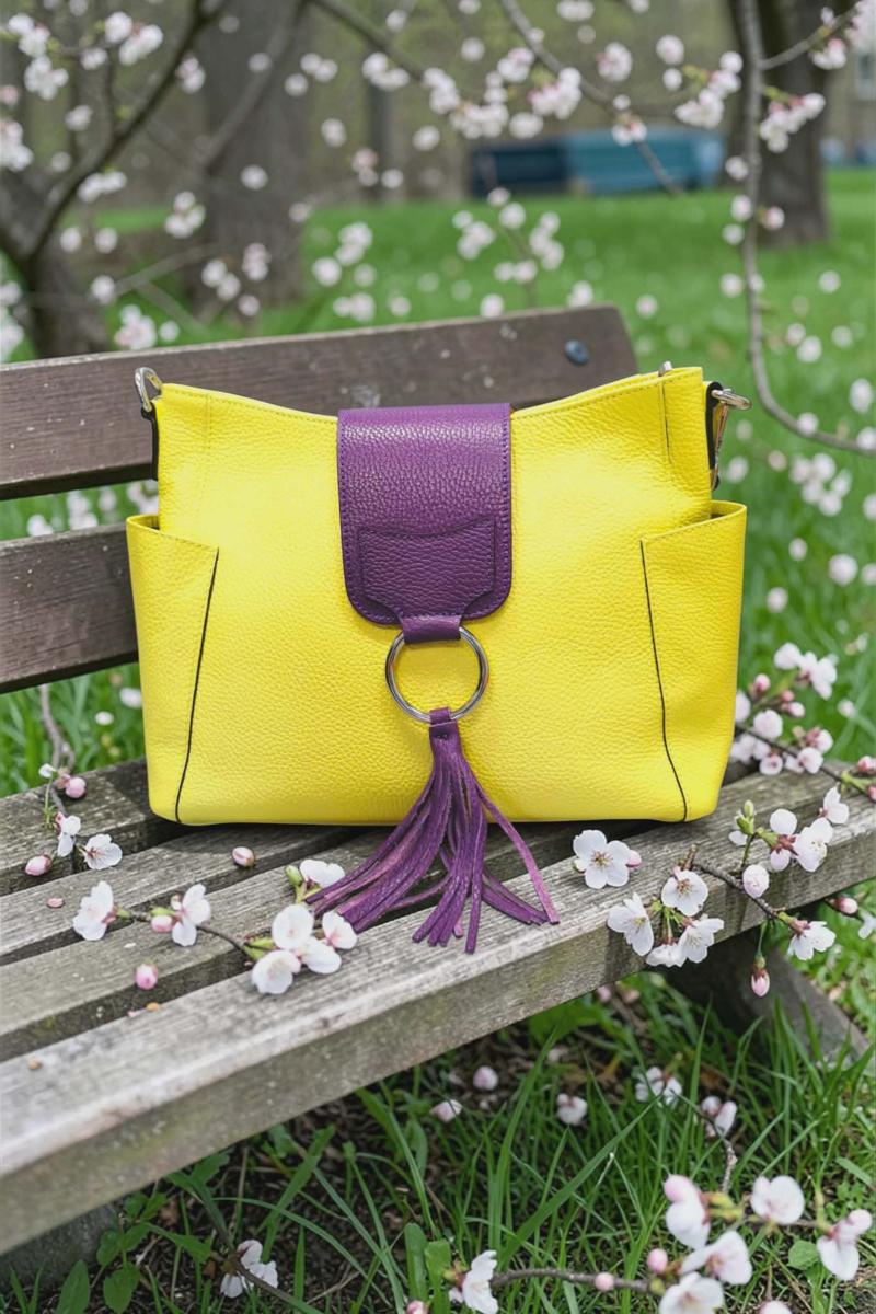 Il est orné d'un large anneau doré ou argenté (au choix) et d'un pompon à franges en cuir martelé.